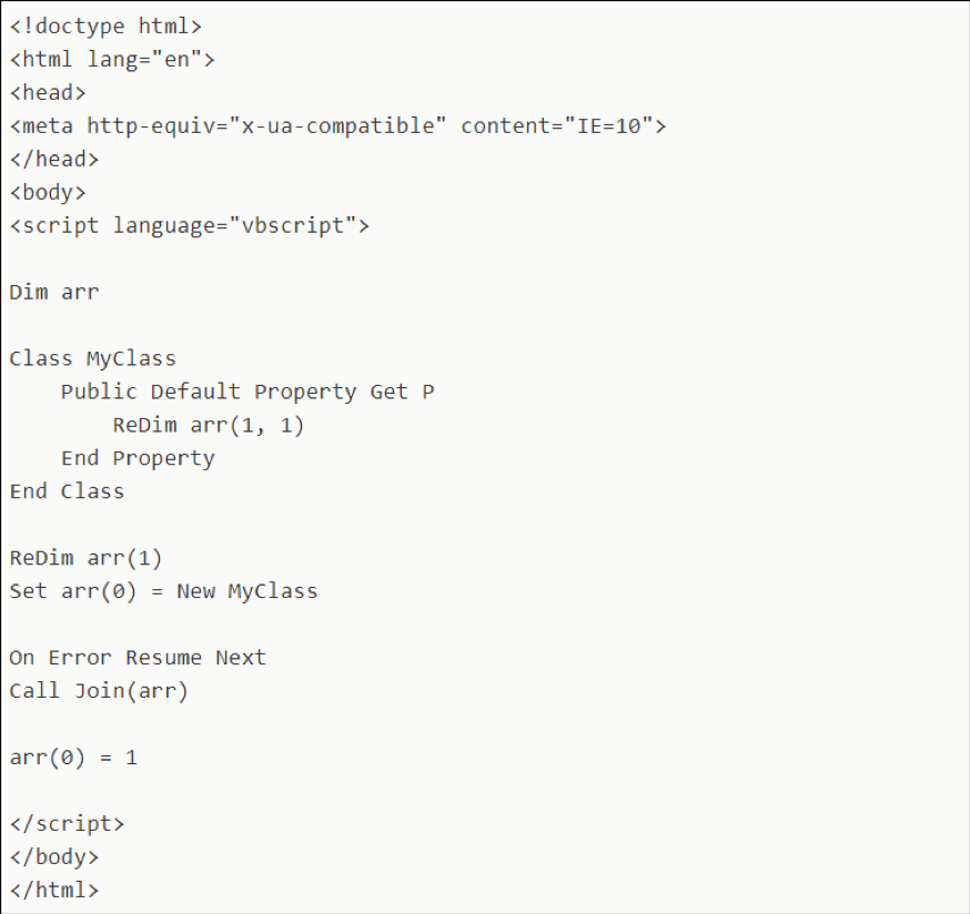 盡管微軟已經(jīng)在2019年8月的IE更新中全面禁用了vbscript,但出于安全性考慮,完整利用代碼不予公開。