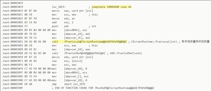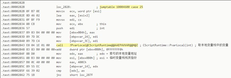 在IDA Pro中對(duì)vbscript!CScriptRuntime::RunNoEH進(jìn)行逆向,我們來(lái)看一下上述兩個(gè)指令解釋分支的匯編代碼:?