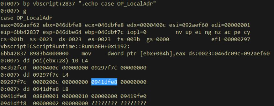 筆者在開啟頁(yè)堆后對(duì)PoC進(jìn)行了調(diào)試。我們先將斷點(diǎn)下到OP_LocalAdr指令的解釋分支,可以看到Join(arr)執(zhí)行時(shí)訪問(wèn)到的arr,命中斷點(diǎn)時(shí)ebx即為CScriptRuntime,調(diào)試時(shí)arr從本地變量棧(ebx+0x28)進(jìn)行索引,讀者請(qǐng)留意下圖中藍(lán)色高亮的指針,ReDim語(yǔ)句執(zhí)行后它會(huì)發(fā)生變化。