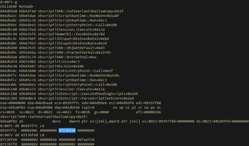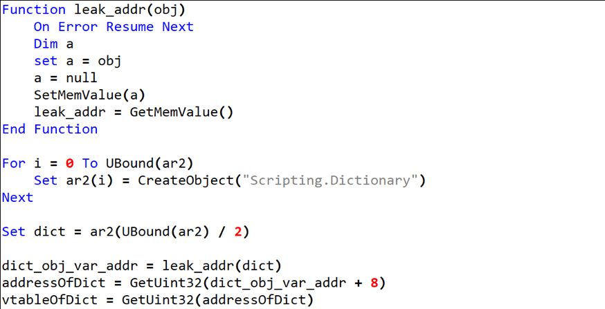 在前面的基礎(chǔ)上,就可以泄露一個(gè)指針對(duì)象以繞過(guò)ASLR,這里筆者采用的方法和和CVE-2019-0752一樣,泄露一個(gè)Scripting.Dictionary對(duì)象的虛表指針,具體操作如下: