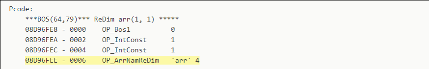 這里再引述一下上面提到的P-Code,可以看到ReDim arr(1, 1)這句語(yǔ)句對(duì)應(yīng)的P-Code如下:?