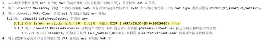 微軟采用對(duì)SafeArray加鎖的方式來(lái)修補(bǔ)這個(gè)由之前的補(bǔ)丁引入的問(wèn)題。SafeArrayLock會(huì)令pSafeArr->cLocks的值+1。這樣,當(dāng)在安裝9月補(bǔ)丁后再次打開PoC。由于前面的+1操作,就可以令ReDim指令無(wú)法得到正常執(zhí)行,我們來(lái)看一下具體的邏輯。