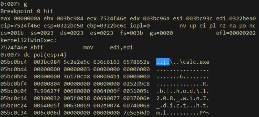 這里提一個(gè)筆者編寫利用時(shí)遇到的問(wèn)題,筆者一開始是在windows7 sp1 x86環(huán)境下寫的利用,代碼全部寫完后發(fā)現(xiàn)計(jì)算器無(wú)法彈出,一番調(diào)試后發(fā)現(xiàn),傳入WinExec函數(shù)的命令行參數(shù)無(wú)法得到正常解釋,原因也很簡(jiǎn)單,來(lái)看一下某次win7調(diào)試時(shí)最終傳給WinExec的參數(shù):