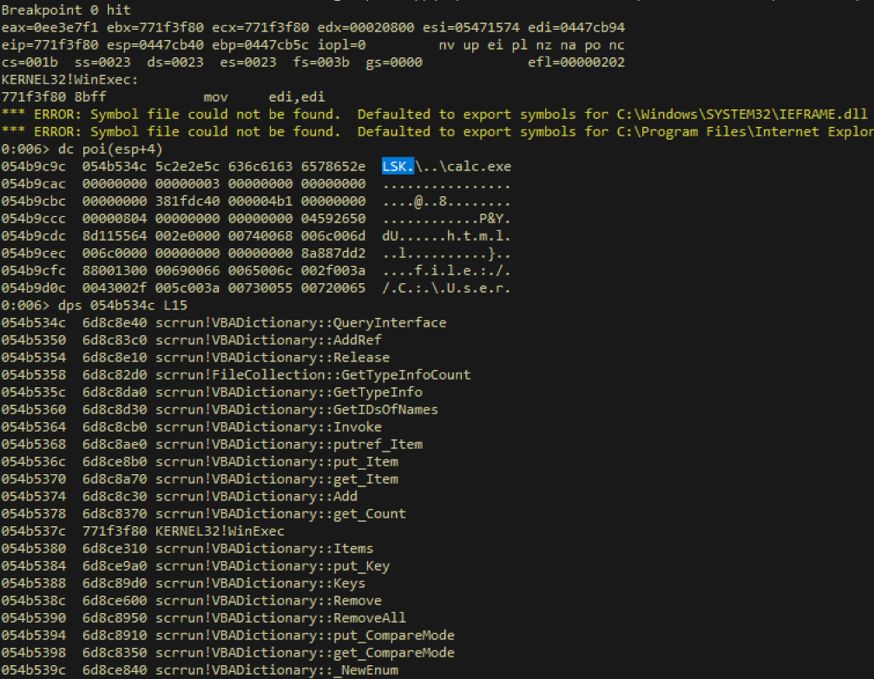2.借助BSTR復(fù)制并偽造一個(gè)假的Dictionary對(duì)象(fake_dict),將虛表替換為上述的假虛表,將WinExec的命令行參數(shù)寫入虛表指針后4字節(jié)開始的地址