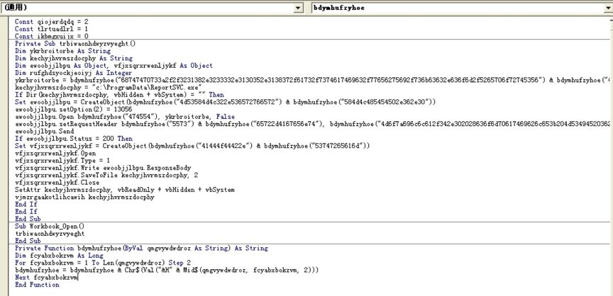 文檔利用形式相同,都使用了相似的惡意宏代碼,我們拿出其中一個(gè)進(jìn)行分析,如“????_191030.xls”文檔。