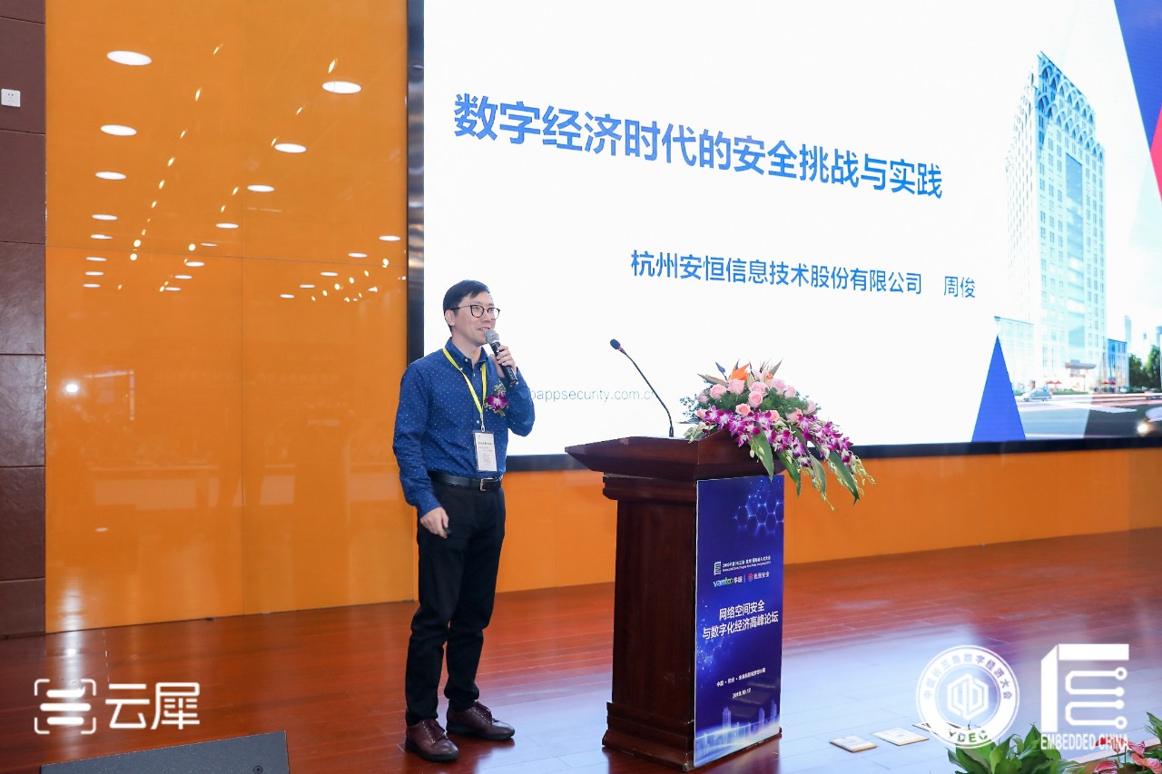 安恒信息智慧城市運(yùn)營中心總監(jiān)周俊受邀參加了本次論壇,并進(jìn)行了《數(shù)字經(jīng)濟(jì)時(shí)代的安全挑戰(zhàn)與實(shí)踐》的主題分享。周俊認(rèn)為,在數(shù)字經(jīng)濟(jì)時(shí)代,數(shù)據(jù)成為了新的生產(chǎn)要素,驅(qū)動(dòng)了商業(yè)模式的變革,數(shù)據(jù)安全正在成為新商業(yè)模式的重要一環(huán)。周俊在演講中全面分析了當(dāng)前數(shù)據(jù)安全面臨的挑戰(zhàn),并提出了安恒信息以數(shù)據(jù)為中心的安全體系建設(shè)思路。