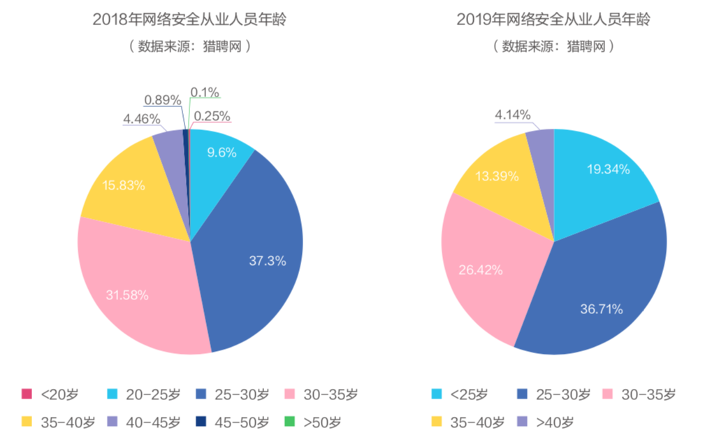 在網(wǎng)絡(luò)安全從業(yè)人員年齡來(lái)看,網(wǎng)絡(luò)安全從業(yè)人員的年齡最多集中在25-30歲之間,占比為36.71%,但25歲以下的網(wǎng)絡(luò)安全從業(yè)人員相比2018年的9.6%占比顯著提高,占總數(shù)的19.34%。