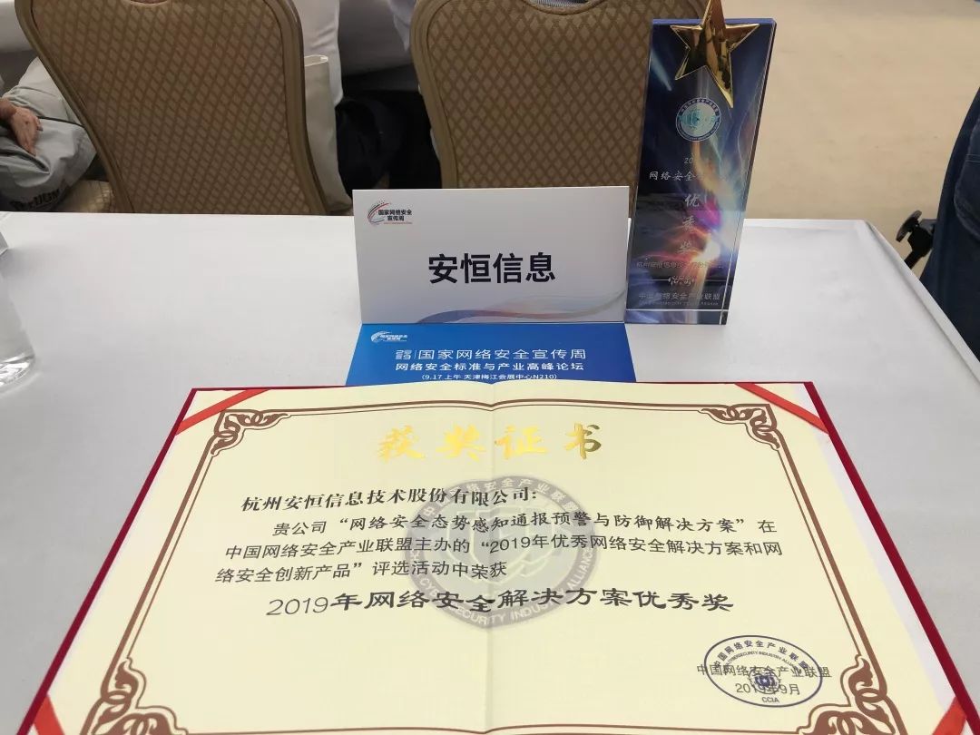 在今天的網(wǎng)絡(luò)安全標(biāo)準(zhǔn)與產(chǎn)業(yè)高峰論壇上,安恒信息“基于大數(shù)據(jù)的工控態(tài)勢(shì)感知監(jiān)測(cè)預(yù)警系統(tǒng)V2.0”、“網(wǎng)絡(luò)安全態(tài)勢(shì)感知通報(bào)預(yù)警與防御解決方案”分別榮獲由中國(guó)網(wǎng)絡(luò)安全產(chǎn)業(yè)聯(lián)盟所頒發(fā)的“2019年網(wǎng)絡(luò)安全創(chuàng)新產(chǎn)品優(yōu)秀獎(jiǎng)”、“2019年網(wǎng)絡(luò)安全解決方案優(yōu)秀獎(jiǎng)”,安恒信息首席安全官劉志樂代表公司上臺(tái)領(lǐng)獎(jiǎng)。