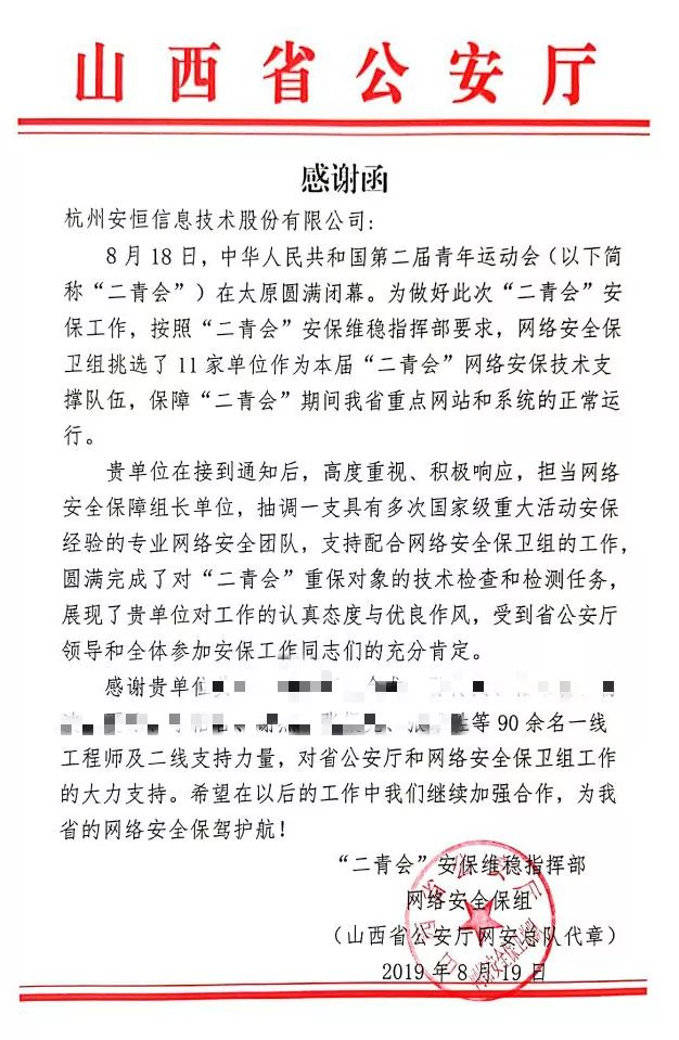 感謝信 | 安恒信息任“二青會”網(wǎng)絡(luò)安保組長單位,圓滿完成任務(wù)!