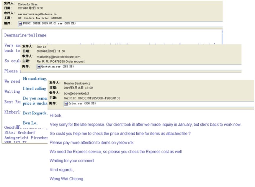 根據(jù)一些關(guān)聯(lián)樣本,攻擊者發(fā)送的主題大多圍繞ORDER、RFQ,、QUOTATION這些商貿(mào)類主題為主,附件名稱也會和主題呼應(yīng)。如:
