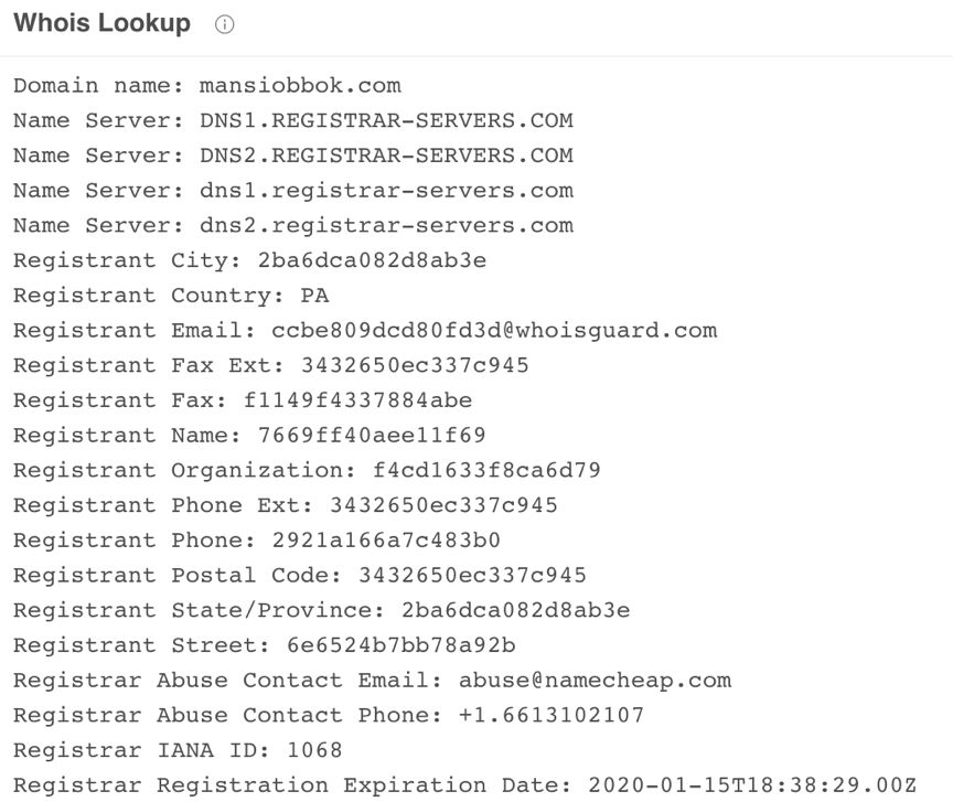 友商曾在2018年初發(fā)布過《CVE-2017-8570首次公開的野外樣本及漏洞分析》一文,文中攻擊組織利用CVE-2017-8570漏洞進(jìn)行文件投遞,投遞樣本使用的payload為FormBook,并且樣本使用VB編寫,也是解密出真正的惡意代碼注入進(jìn)程中執(zhí)行,并且在給出的回連域名中有mansiobbok[.]com這個域名,和我們關(guān)聯(lián)到的mansiobbok[.]info僅后綴不同,查詢mansiobbok[.]com的whois信息,發(fā)現(xiàn)也是在相同地方注冊的域名。