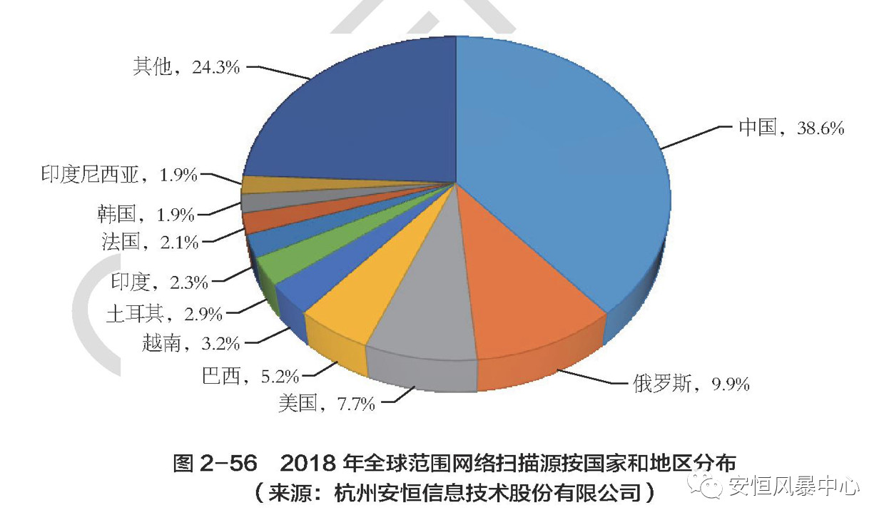 “2018年,杭州安恒信息技術(shù)股份有限公司累計(jì)發(fā)現(xiàn)掃描源21.3萬(wàn)個(gè),其中有38.6%的掃描源來(lái)自中國(guó),9.9%是從俄羅斯發(fā)起的,美國(guó)、巴西、越南緊隨其后,分別是:7.7%、5.2%、3.2%。2018年全球范圍網(wǎng)絡(luò)掃描源按國(guó)家和地區(qū)分布情況如圖2-56所示。” 《2018年中國(guó)互聯(lián)網(wǎng)網(wǎng)絡(luò)安全報(bào)告》