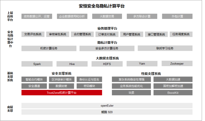 安恒Ailand安全島隱私計算平臺基于鯤鵬BoostKit提供的硬件機(jī)密計算功能所構(gòu)建的安全支撐系統(tǒng),通過支持TrustZone技術(shù)給程序和數(shù)據(jù)提供安全的執(zhí)行環(huán)境;