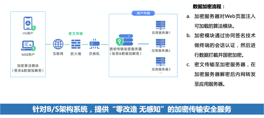 傳輸透明加密系統(tǒng)聚焦于解決用戶業(yè)務(wù)數(shù)據(jù)在網(wǎng)絡(luò)傳輸中潛在的被竊取和篡改風(fēng)險,采用國密SM1、SM2、SM3、SM4密碼算法,對Web應(yīng)用進(jìn)行數(shù)據(jù)透明加密,并實現(xiàn)應(yīng)用系統(tǒng)“零改造”對接。