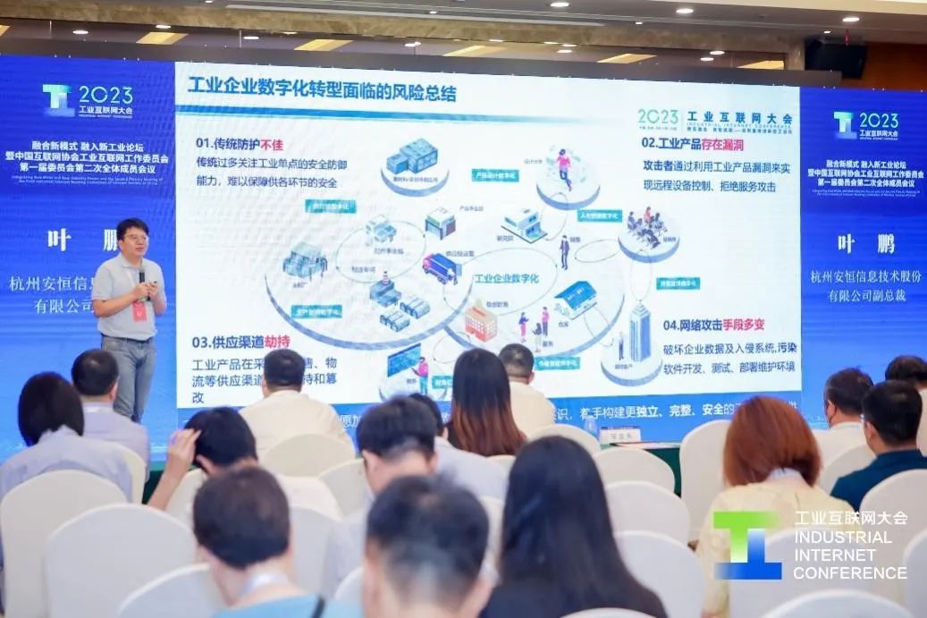 在融合新模式、融入新工業(yè)主題論壇暨中國互聯(lián)網(wǎng)協(xié)會工業(yè)互聯(lián)網(wǎng)工作委員會第一屆委員會第二次全體成員會議上,安恒信息副總裁葉鵬匯報(bào)了安恒信息在工業(yè)領(lǐng)域網(wǎng)絡(luò)和數(shù)據(jù)安全場景的最新實(shí)踐,并對當(dāng)下工業(yè)企業(yè)數(shù)字化轉(zhuǎn)型面臨的風(fēng)險(xiǎn)挑戰(zhàn)進(jìn)行了總結(jié)。
