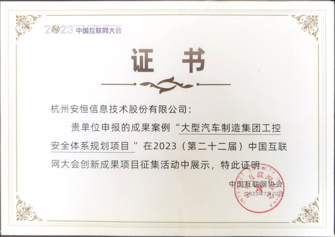 中國互聯(lián)網(wǎng)大會創(chuàng)新成果|安恒信息“大型汽車制造集團工控安全體系規(guī)劃項目”入選
