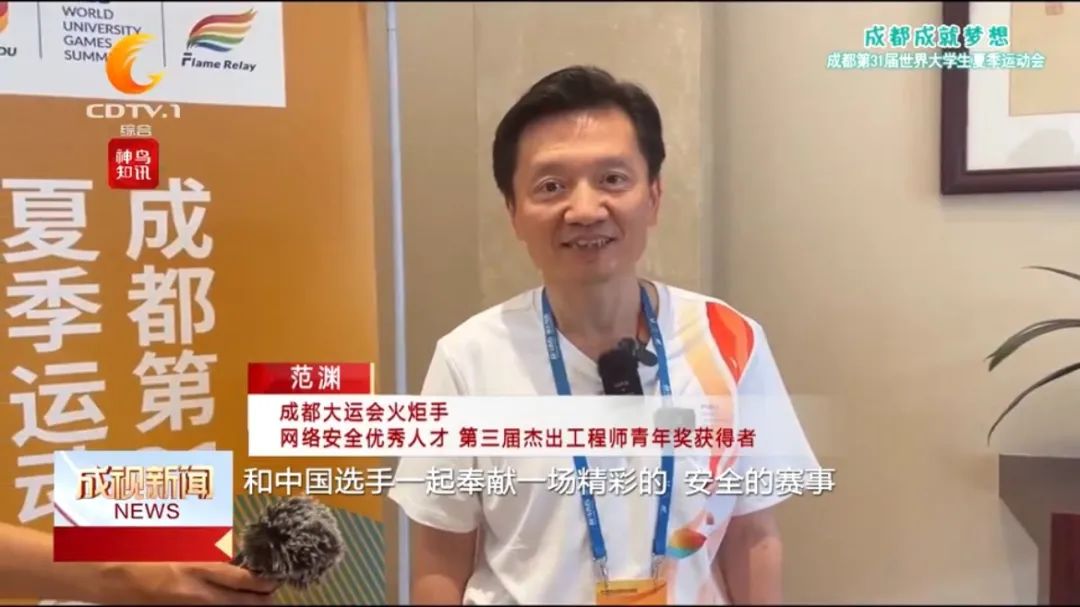 7月26日,成都大運會火炬?zhèn)鬟f迎來最后一個傳遞日?!叭鼗稹蓖緩轿髂辖煌ù髮W、成都理工大學、成都大學三所高校后,傳遞至賽事主場館所在的東安湖體育公園,并舉行隆重的收火儀式。安恒信息董事長范淵作為第104棒火炬手在東安湖體育公園進行接棒傳遞。