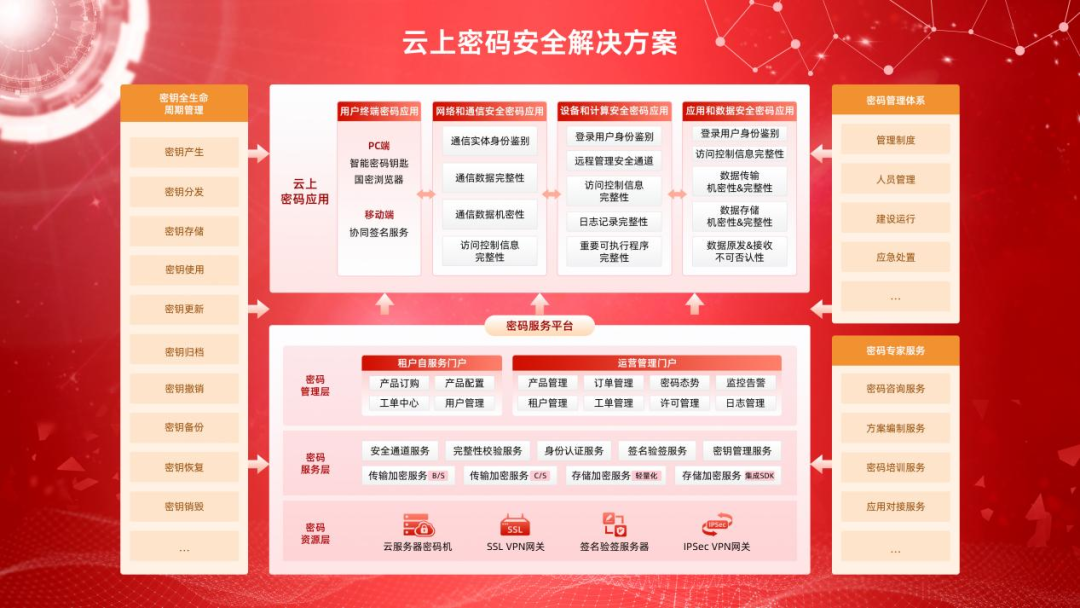 安恒信息云上密碼應(yīng)用解決方案,解決了以硬件為主的傳統(tǒng)商用密碼產(chǎn)品無法有效適應(yīng)云計算彈性擴(kuò)容、按需分配的問題,通過建設(shè)密碼服務(wù)平臺,將各類密碼能力以服務(wù)化的方式向云租戶提供,更符合云場景下能力訂閱、動態(tài)伸縮的需求。同時,密碼服務(wù)能力已成功接入安恒云-天池云安全管理平臺,用戶可通過一套平臺擁有涵蓋等保安全、數(shù)據(jù)安全、商用密碼的全棧安全能力,一站式解決云上安全問題。