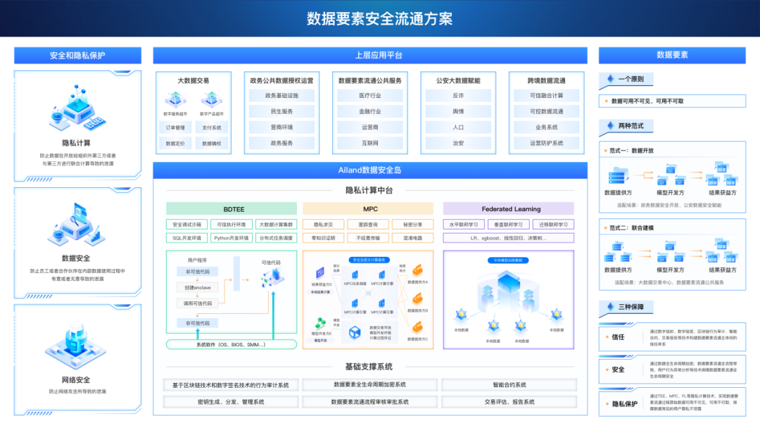 針對數(shù)據(jù)加密場景,安恒信息推出以傳輸透明加密、數(shù)據(jù)庫透明存儲加密產(chǎn)品為主的數(shù)據(jù)透明加密解決方案。基于商用密碼技術(shù)對傳輸環(huán)節(jié)的動態(tài)數(shù)據(jù)及存儲環(huán)節(jié)的靜態(tài)數(shù)據(jù)進(jìn)行加密,在保障數(shù)據(jù)安全性的同時,將對用戶業(yè)務(wù)的影響降到最低。針對數(shù)據(jù)可信流通場景,安恒信息通過商用密碼與可信執(zhí)行環(huán)境、安全多方計算、聯(lián)邦學(xué)習(xí)等隱私計算相關(guān)技術(shù)相結(jié)合,實現(xiàn)共享數(shù)據(jù)的所有權(quán)和使用權(quán)分離,確保原始數(shù)據(jù)的“可用不可見”、“可用不可取”,保障多方數(shù)據(jù)聯(lián)合計算過程的可靠、可控和可溯。