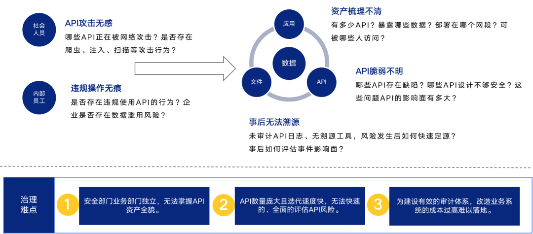 3. API 數(shù)據(jù)泄露風險無感知:未對API?調(diào)用行為進行監(jiān)測和預警異常的調(diào)用?API?行為,無法及時發(fā)現(xiàn)是否有泄密、爬取的風險行為。