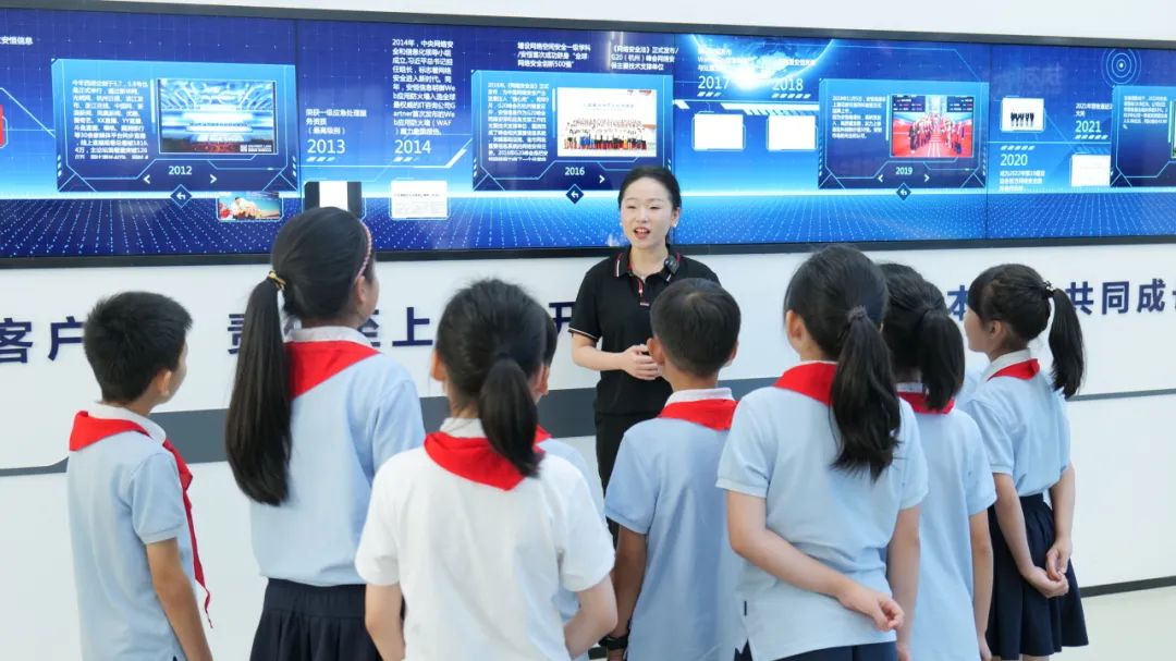 隨后,小記者們?cè)诠ぷ魅藛T的帶領(lǐng)下前往展廳參觀,以直觀的方式對(duì)網(wǎng)絡(luò)安全進(jìn)行全面了解。直播間的主持人以直觀真實(shí)互動(dòng)的方式向小記者們介紹了安恒信息的發(fā)展歷程,并以與其息息相關(guān)的場(chǎng)景舉例,無論在學(xué)校還是醫(yī)院、會(huì)議或是比賽,網(wǎng)絡(luò)安全時(shí)時(shí)刻刻都在我們身邊影響著。