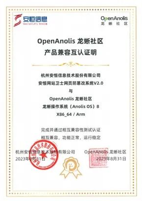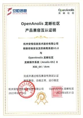 2023 年 9 月,安恒信息產(chǎn)品明御終端安全級(jí)防病毒系統(tǒng)與安恒網(wǎng)站衛(wèi)士網(wǎng)頁(yè)防篡改系產(chǎn)品完成了與龍蜥操作系統(tǒng)(Anolis OS)在 x86、AArch64 兩個(gè)不同架構(gòu)下的相互兼容性測(cè)試認(rèn)證,結(jié)果顯示:相互兼容,功能正常,運(yùn)行穩(wěn)定。