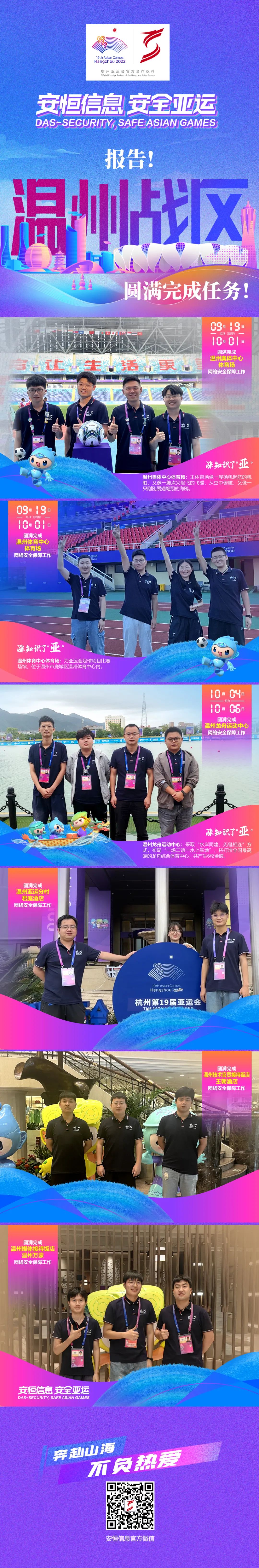 10月6日,隨著杭州亞運(yùn)會(huì)龍舟比賽最后兩個(gè)項(xiàng)目完成角逐,中國(guó)代表隊(duì)以5金和1銀的佳績(jī),創(chuàng)亞運(yùn)會(huì)該項(xiàng)目最好成績(jī)。安恒信息溫州亞運(yùn)網(wǎng)絡(luò)安全保障團(tuán)隊(duì)也圓滿完成保障工作。