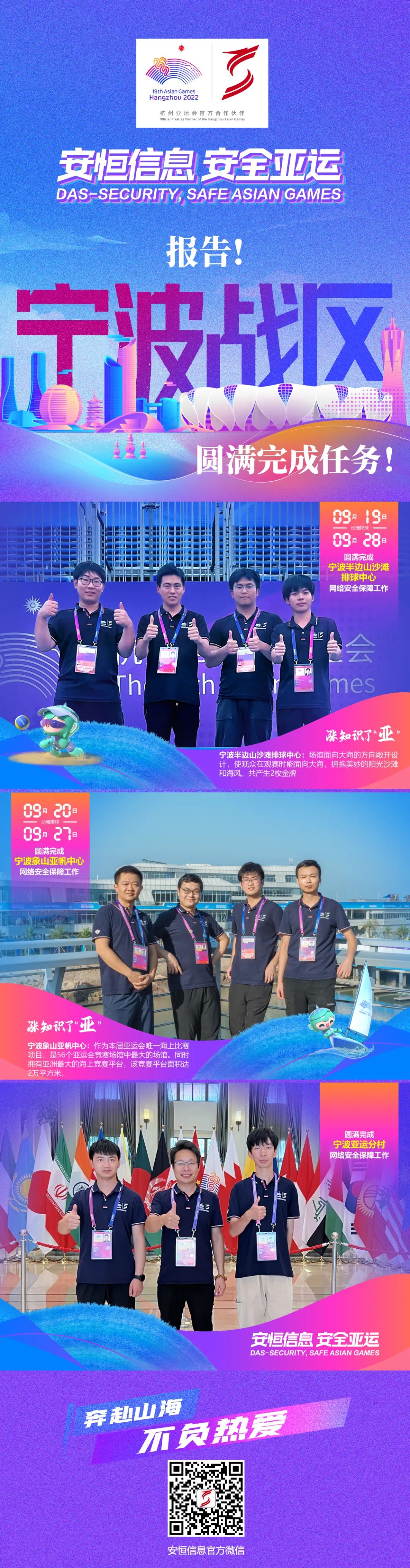 在此前的9月28日,安信信息同樣為寧波賽事的網(wǎng)絡(luò)安全保障工作交上完美答卷。至此,安恒信息六大主戰(zhàn)區(qū),已有兩大戰(zhàn)區(qū)完成保障任務(wù)!