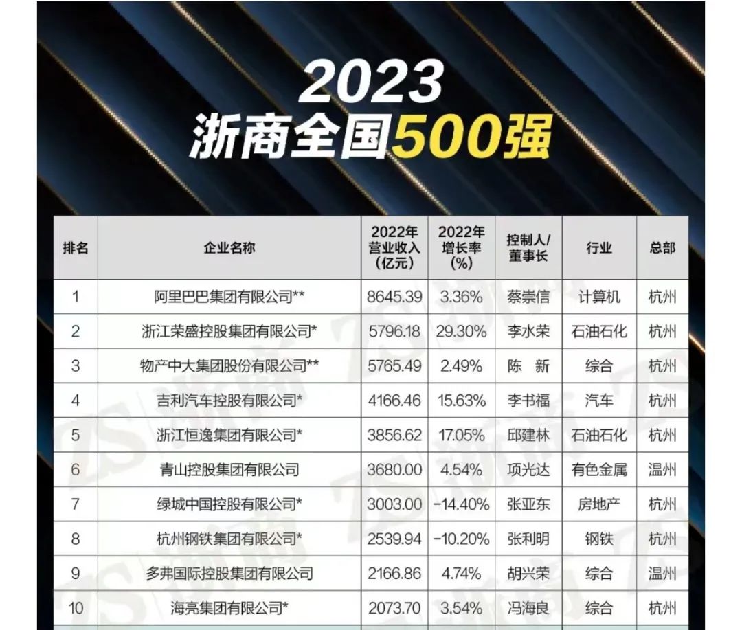 “2023浙商全國500強”榜單