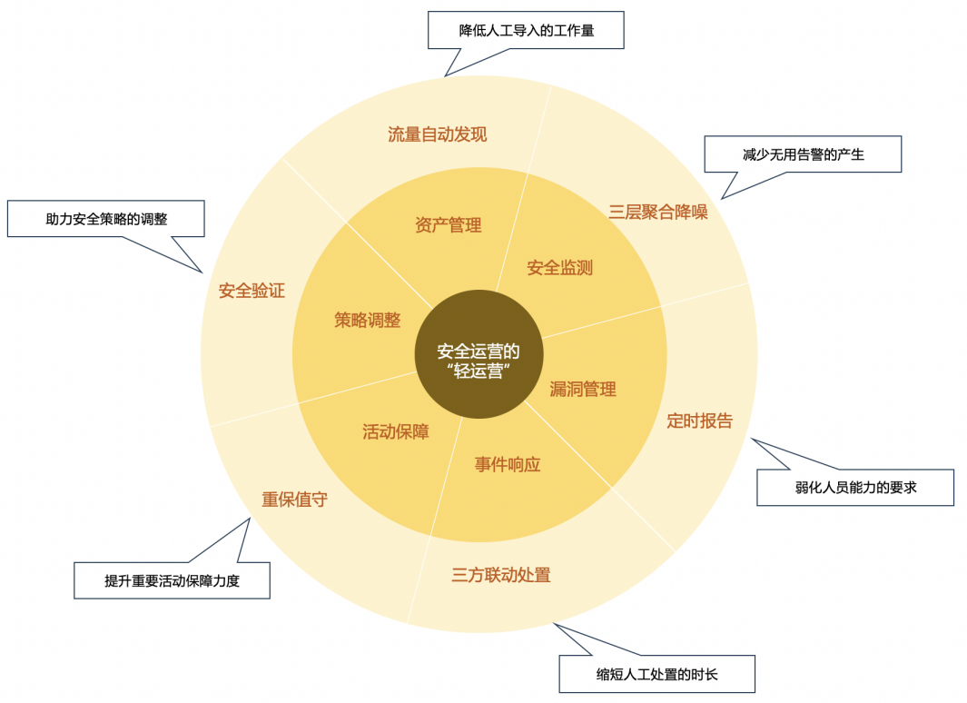 對于“輕運營”定義,可以這樣理解:“輕運營”是以資產(chǎn)為核心,基于安全運營平臺,建立一套實時的資產(chǎn)風險模型,實現(xiàn)自動化或半自動化事件風險分析、預警和處置閉環(huán)的集中安全管理體系。其中關鍵點有兩個:1)自動化或半自動化;2)流程要閉環(huán)處置。在世界范圍,尤其在中國,中小企業(yè)、醫(yī)院、高校等單位還是占大多數(shù),而這些單位信息化運營人員都少之又少,更何況安全運營人員?如果有一套安全產(chǎn)品能幫助企業(yè)摸清家底、度量安全水平、自動化或半自動化的閉環(huán)處置掉當天的事件,做到“今日事,今日畢”,那無疑是有價值的。