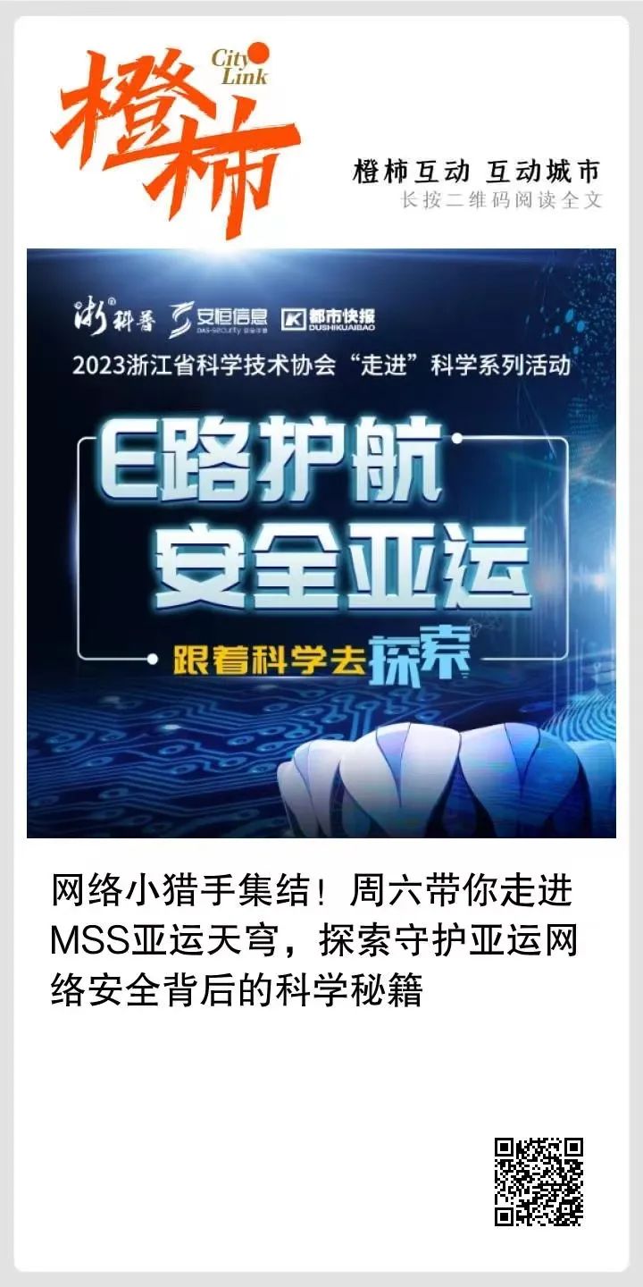 這個(gè)周六,機(jī)會(huì)來(lái)了!“浙”里網(wǎng)絡(luò)小獵手快快集結(jié)!浙江省科協(xié)聯(lián)合都市快報(bào)推出的科學(xué)走進(jìn)活動(dòng),這次將帶領(lǐng)大家走進(jìn)杭州亞運(yùn)會(huì)官方網(wǎng)絡(luò)安全服務(wù)合作伙伴安恒信息,跟著浙里科普,一起了解“網(wǎng)安神器”,感受“智能亞運(yùn)”,助力提高全民網(wǎng)絡(luò)安全意識(shí),為數(shù)字中國(guó)安全保駕護(hù)航。