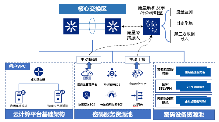 ■ 流量監(jiān)測:通過密碼探針旁掛于核心交換機,解析旁路流量中加解密、簽名驗簽等密碼調(diào)用數(shù)據(jù)。