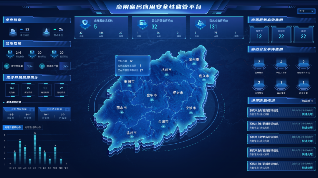 以云平臺和云租戶系統(tǒng)過密評為例:密碼監(jiān)管平臺匯總資產(chǎn)、密碼服務(wù)狀態(tài)、事件告警、云租戶應(yīng)用系統(tǒng)密評進度等信息,利用態(tài)勢感知技術(shù)提供的數(shù)據(jù)分析和可視化能力,統(tǒng)一展示密碼安全態(tài)勢信息。