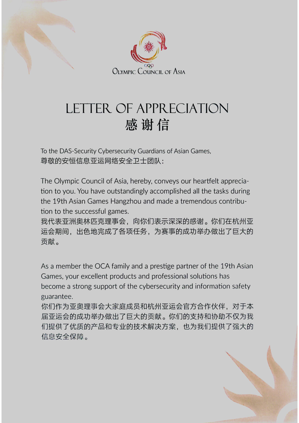 為亞洲體育事業(yè)貢獻(xiàn)力量!安恒信息收獲亞奧理事會(huì)感謝信
