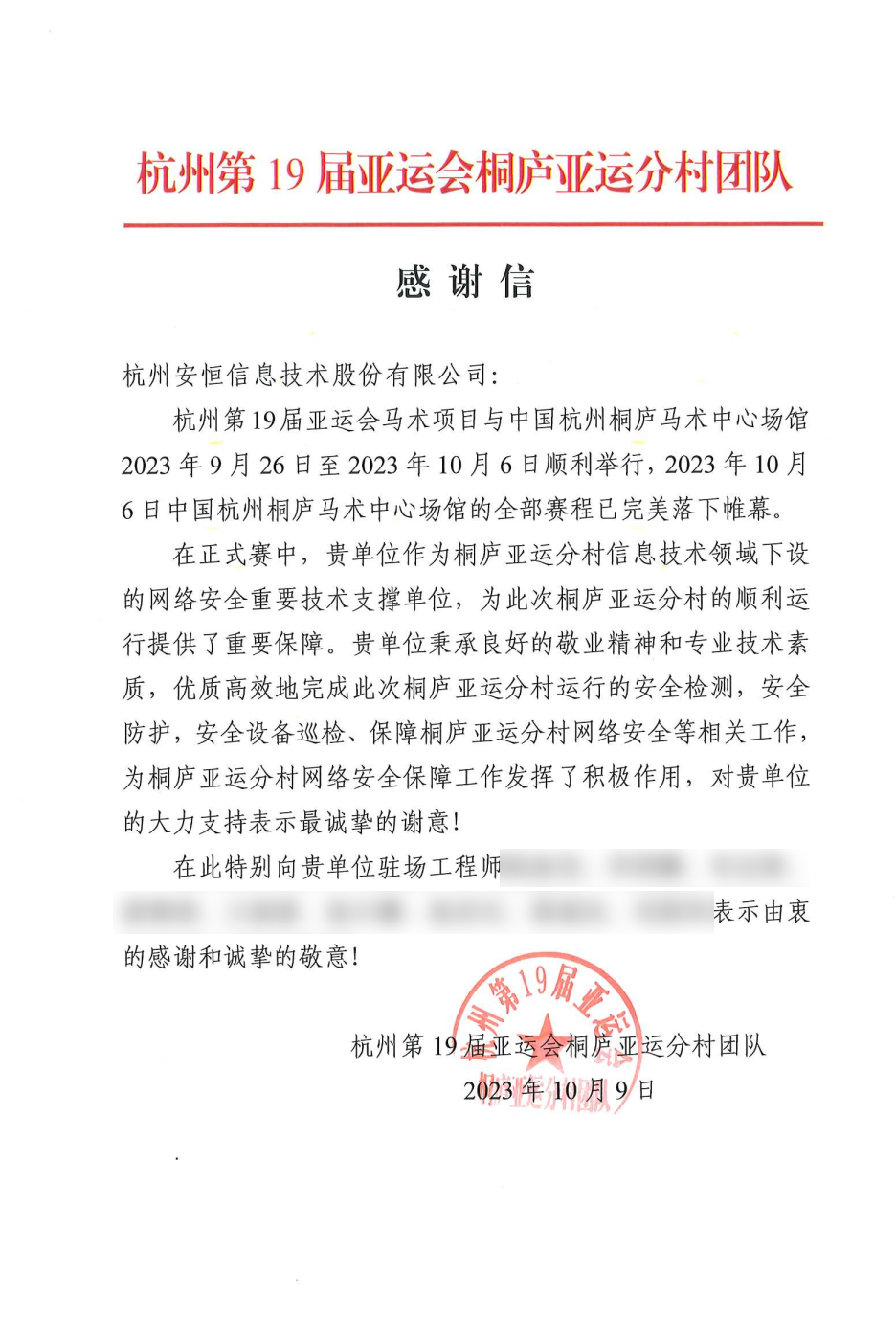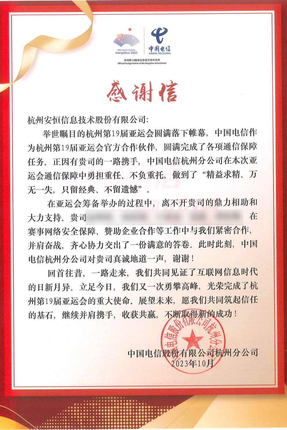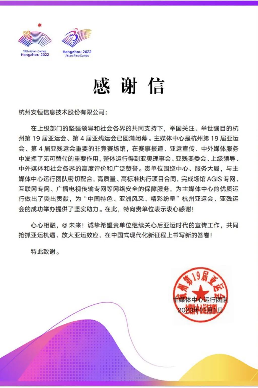 杭州第19屆亞運會組委會、杭州第4屆亞殘運會組委會在感謝信中表示,安恒信息高度重視,以精益求精的態(tài)度、嚴謹細致的作風、團結協(xié)作的精神,高質量完成各項服務保障工作,為成功舉辦杭州亞運會、亞殘運會做出了卓越的貢獻,必將被永久銘記。