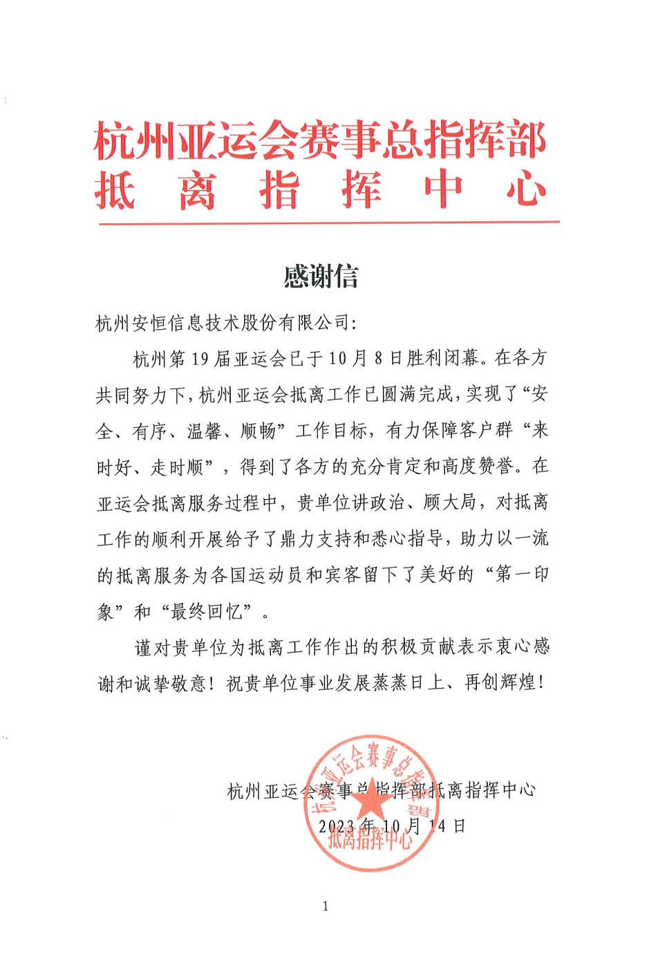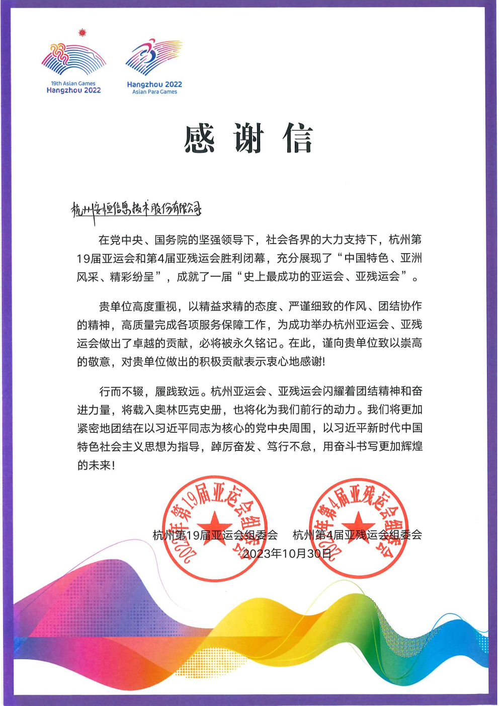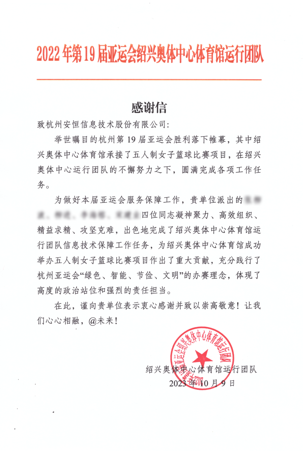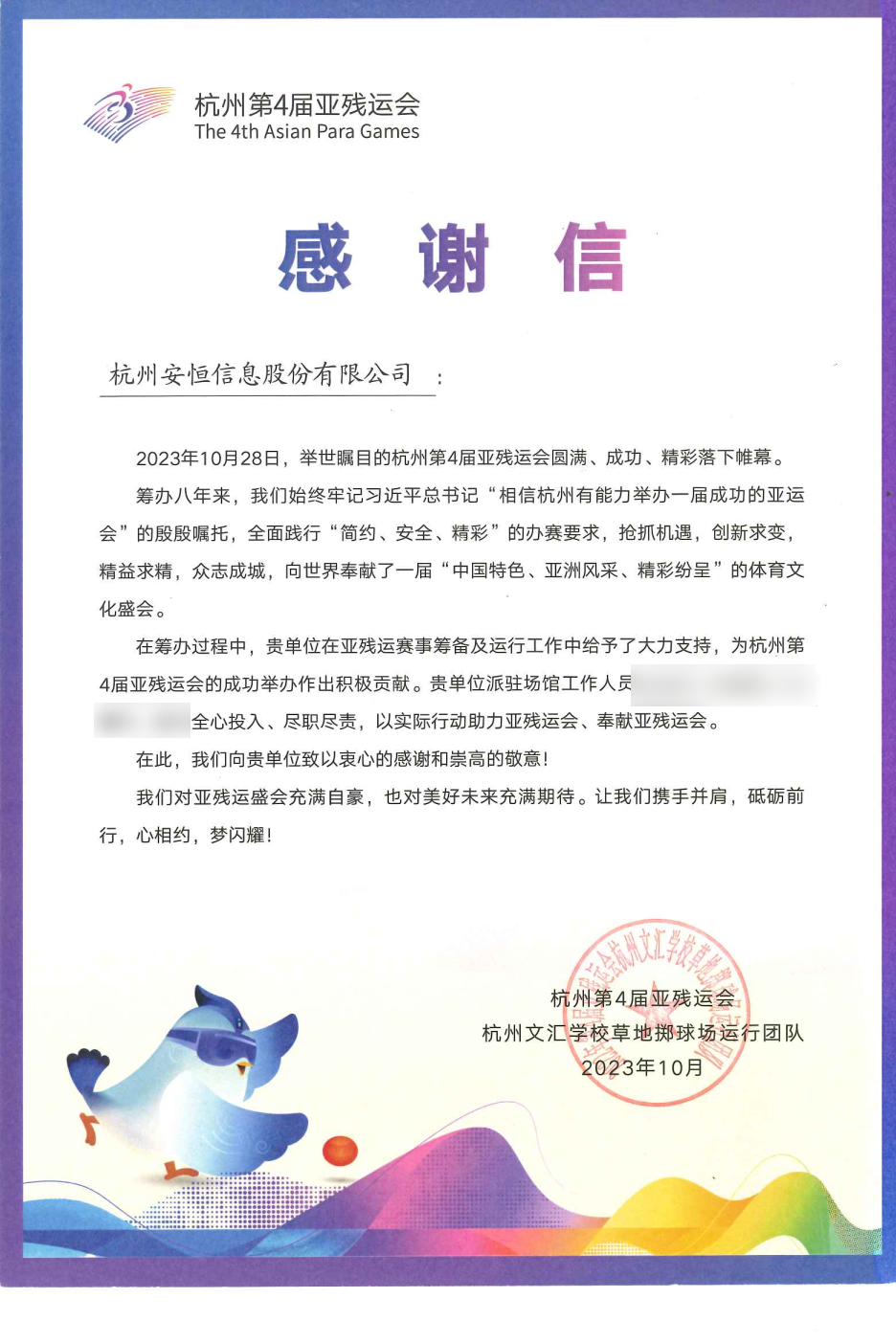 杭州第19屆亞運會組委會、杭州第4屆亞殘運會組委會在感謝信中表示,安恒信息高度重視,以精益求精的態(tài)度、嚴謹細致的作風、團結協(xié)作的精神,高質量完成各項服務保障工作,為成功舉辦杭州亞運會、亞殘運會做出了卓越的貢獻,必將被永久銘記。