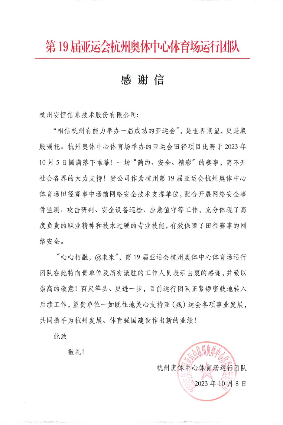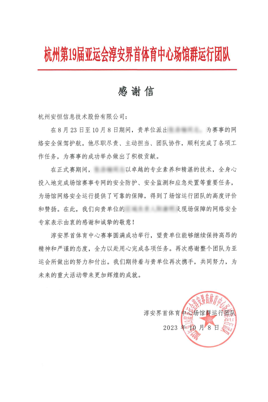 安恒信息還收到了來自各個競賽與非競賽場館運行團隊的感謝信。主媒體中心、賽事總指揮部抵離指揮中心、杭州奧體中心體育場、淳安界首體育中心場館群等多個場館的運行團隊在感謝信中寫到,作為杭州第 19屆亞運會各場館的網絡安全技術支撐單位,安恒信息配合開展各項網絡安全保障工作,充分體現了高度負責的職業(yè)精神和技術過硬的專業(yè)技能,全面、有效地守護網絡安全,并對安恒信息表示由衷地感謝。