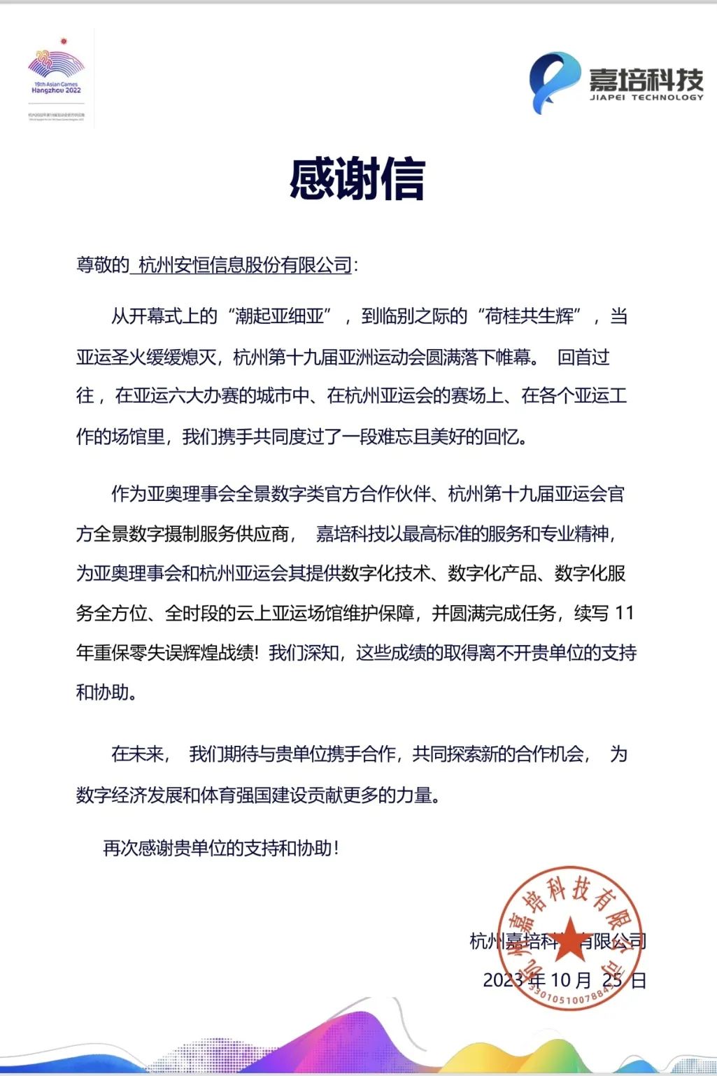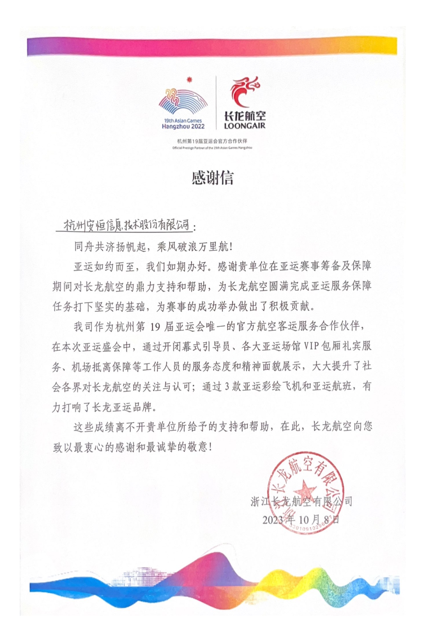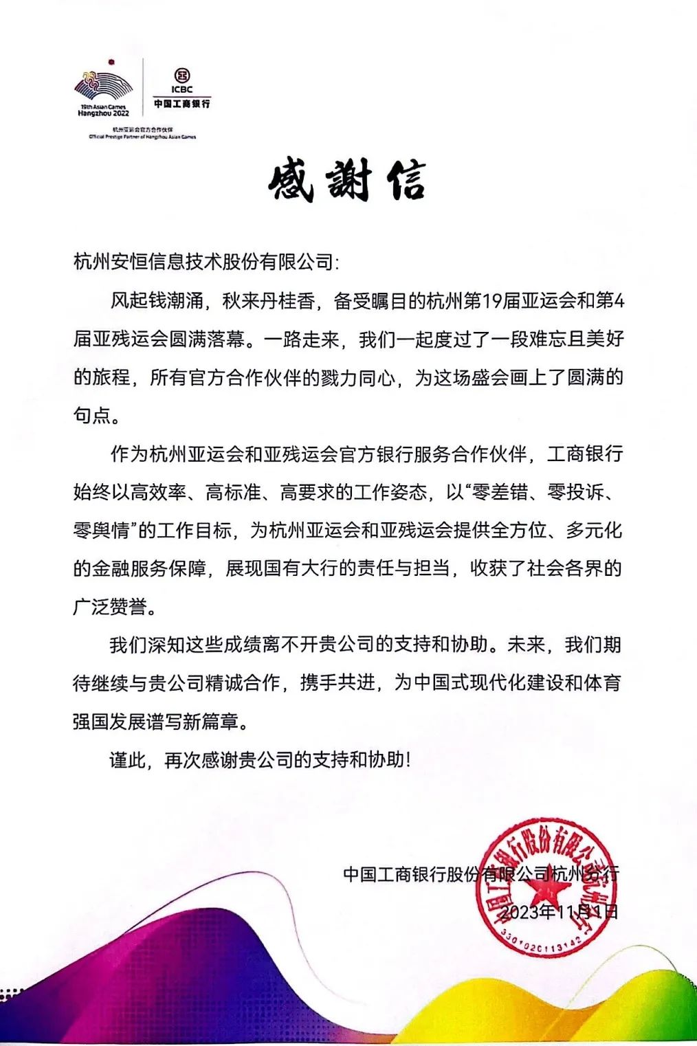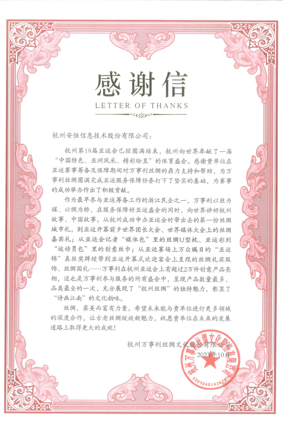安恒信息也收到了多封來自于杭州亞運會供應商、贊助商、合作伙伴的感謝信。在信中,有對安恒信息的肯定與感謝,也有對未來攜手的期待與展望。安恒信息也將與各位伙伴一起,繼續(xù)并肩、共進,譜寫新的篇章。