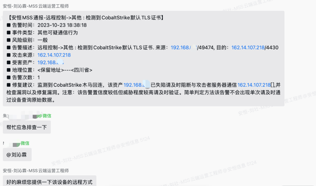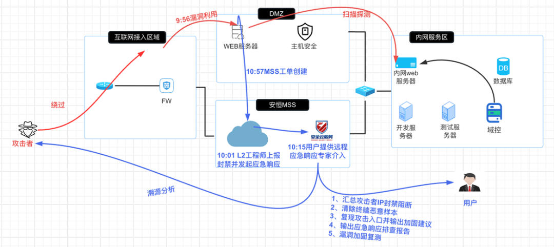③MSS服務(wù)人員確定資產(chǎn)已失陷,同步用戶風(fēng)險及時阻斷并上報應(yīng)急響應(yīng)專家組為用戶提供應(yīng)急溯源分析;