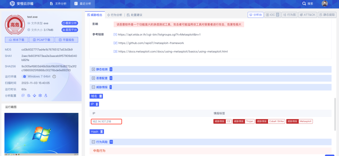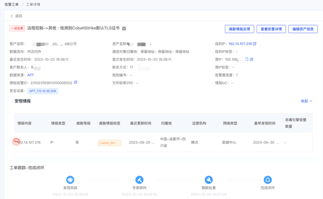 10月的某天凌晨,云端安全分析人員發(fā)現(xiàn)該供應(yīng)商某管理系統(tǒng)出現(xiàn)異常告警:CS特征流量告警,通過對告警詳情分析,確認機器失陷。值班人員立即電話聯(lián)系用戶對接人,在說明情況并得到用戶確認后,斷網(wǎng)處理的同時對CS外連IP進行封堵。