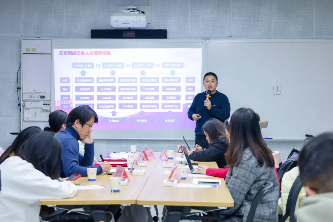 吳鳴旦介紹道,為響應(yīng)國家在網(wǎng)信人才培養(yǎng)方面的有關(guān)要求和高校求實(shí)創(chuàng)新需求,安恒信息以自身行業(yè)資源、產(chǎn)業(yè)背景和技術(shù)積累為基礎(chǔ),于2016年成立安恒數(shù)字人才創(chuàng)研院,并將人才戰(zhàn)略作為公司發(fā)展三大戰(zhàn)略之一。同時(shí),他還對網(wǎng)絡(luò)安全人才培養(yǎng)總體框架、體系作了介紹,并詳細(xì)說明了重保網(wǎng)絡(luò)安全衛(wèi)士的培養(yǎng)方案、途徑、案例和成果等。