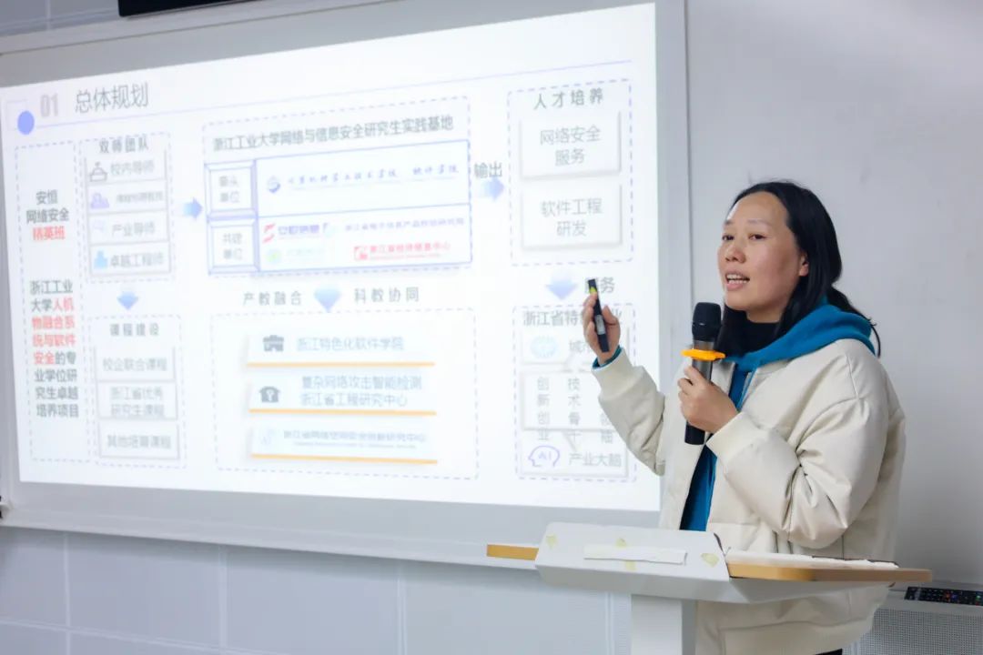 何玲娜則對學(xué)院校企合作的總體規(guī)劃和具體路徑作出詳細(xì)闡述,介紹了浙江特色化軟件學(xué)院的建設(shè)情況以及與安恒信息在產(chǎn)教融合方面的合作成果,并對安恒精英班、人機(jī)物融合系統(tǒng)與軟件安全等項(xiàng)目的具體開展,介紹了學(xué)院向安恒信息人才輸出的實(shí)例。