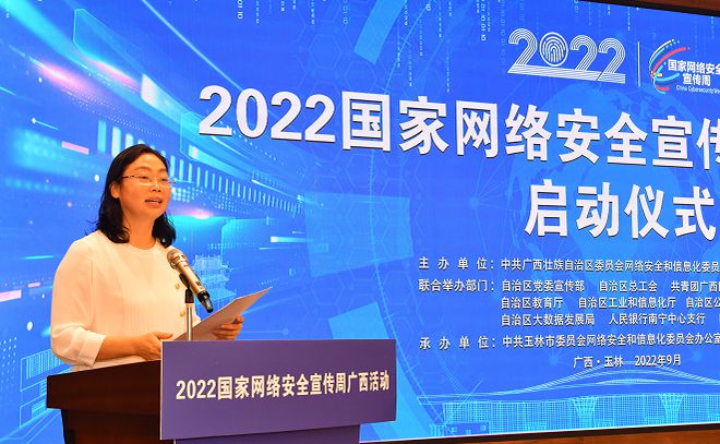 廣西區(qū)黨委宣傳部副部長、網(wǎng)信辦主任韋鳳云講話并宣布2022年國家網(wǎng)絡安全宣傳周廣西活動啟動