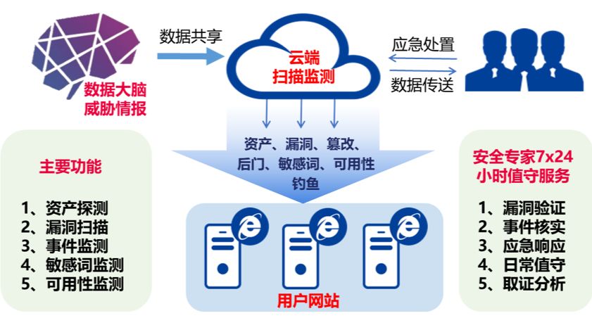 資產(chǎn)探測服務(wù):幫助用戶快速掌握暴露在互聯(lián)網(wǎng)中的資產(chǎn)分布及安全態(tài)勢。摸清資產(chǎn)底數(shù),以便開展后續(xù)的監(jiān)測、防護工作。