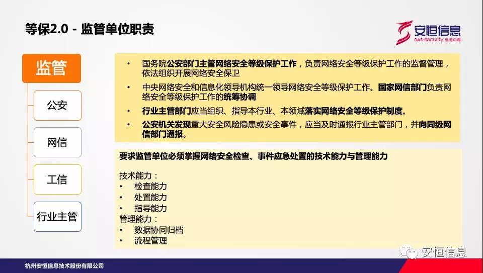 監(jiān)管單位作為督導(dǎo)部門,對信息系統(tǒng)網(wǎng)絡(luò)安全情況負(fù)有監(jiān)督、指導(dǎo)的職責(zé)。無論是《網(wǎng)絡(luò)安全法》還是《網(wǎng)絡(luò)安全等級保護條例(征求意見稿)》都講到公安、網(wǎng)信、行業(yè)主管部門要協(xié)作履行監(jiān)管職能。這就要求從技術(shù)能力與管理能力雙向提升,以滿足在等保2.0監(jiān)管過程中的檢查、處置、指導(dǎo)、協(xié)調(diào)、統(tǒng)籌等工作需求。