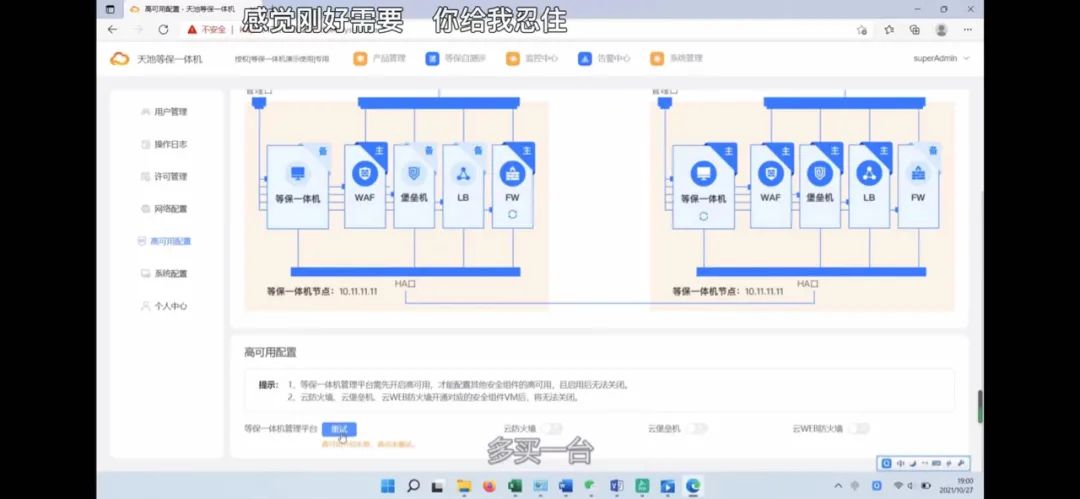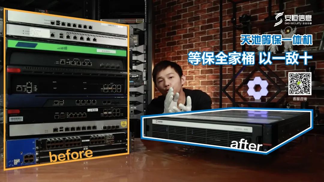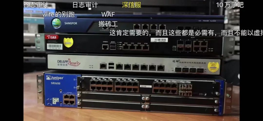 這個(gè)等保一體機(jī)是在技術(shù)層面上具備過(guò)等保2.0的安全設(shè)備。也就是說(shuō),原則上二級(jí)跟三級(jí)等保的過(guò)測(cè)只用它就可以。從等保2.0安全合規(guī)上,這臺(tái)設(shè)備相當(dāng)于我們這里全部的安全設(shè)備。(對(duì),up主在視頻里展示了一摞機(jī)器,足足有十臺(tái)之多)