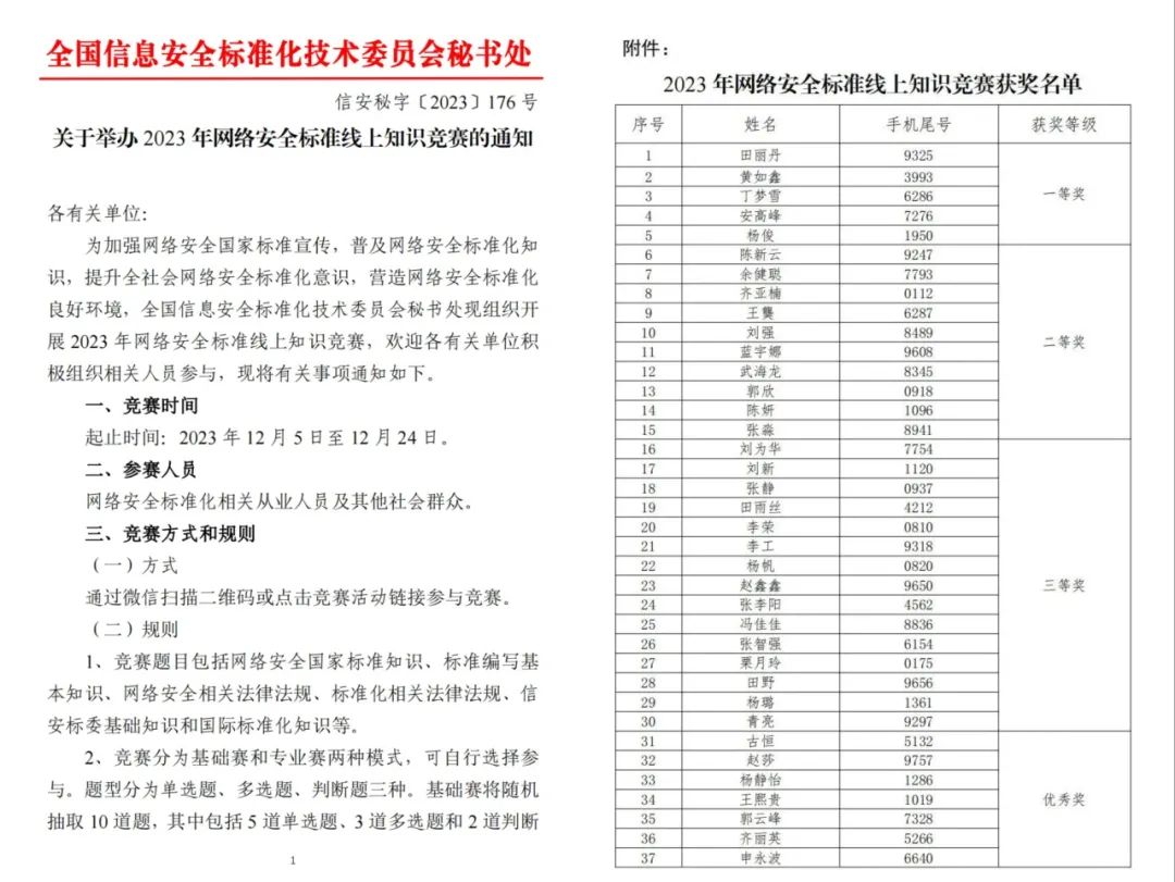 1月10日,在全國(guó)信息安全標(biāo)準(zhǔn)化技術(shù)委員會(huì)組織開(kāi)展的2023年網(wǎng)絡(luò)安全標(biāo)準(zhǔn)知識(shí)競(jìng)賽中,安恒信息田麗丹作為企業(yè)代表參賽并獲得一等獎(jiǎng)。