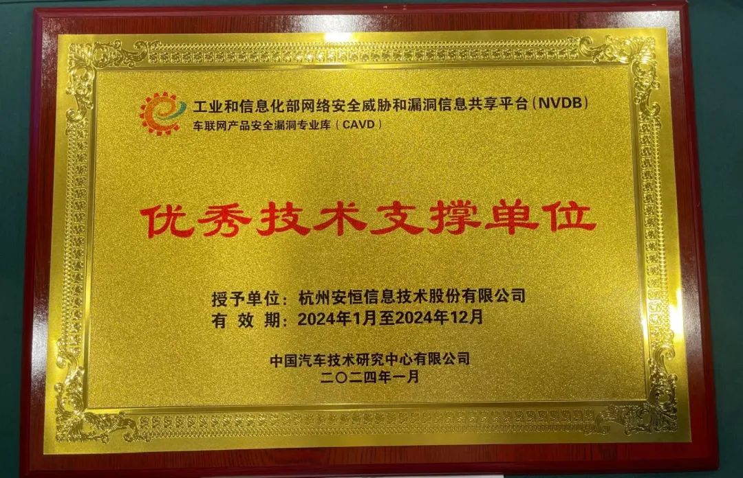 安恒信息獲頒工信部車聯(lián)網(wǎng)產(chǎn)品安全漏洞專業(yè)庫優(yōu)秀技術(shù)支撐單位